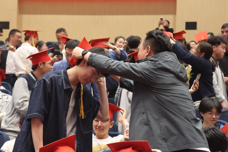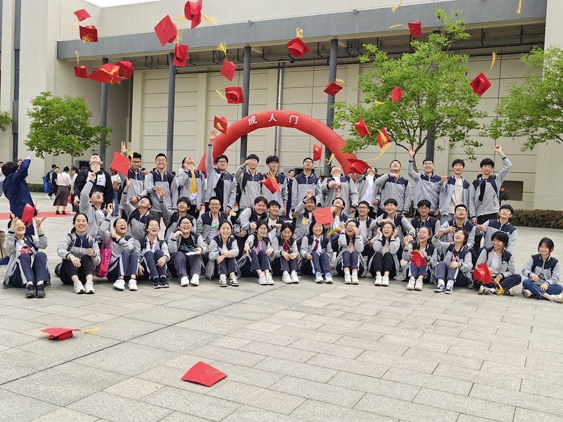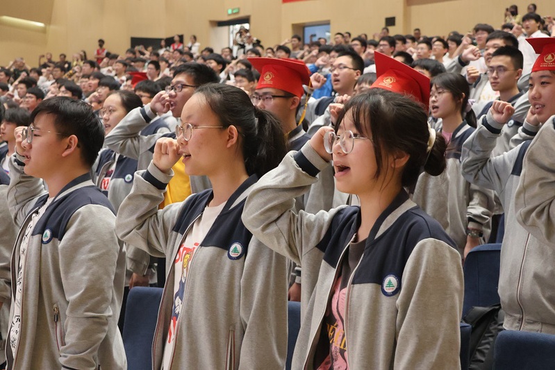高中班主任和学生一起上台,通过歌曲互动、感恩分享等多种形式追忆“承师恩、感校情”的生动情愫,最后高中班主任老师和家长为学生戴上了成人礼帽,携手过成人门。