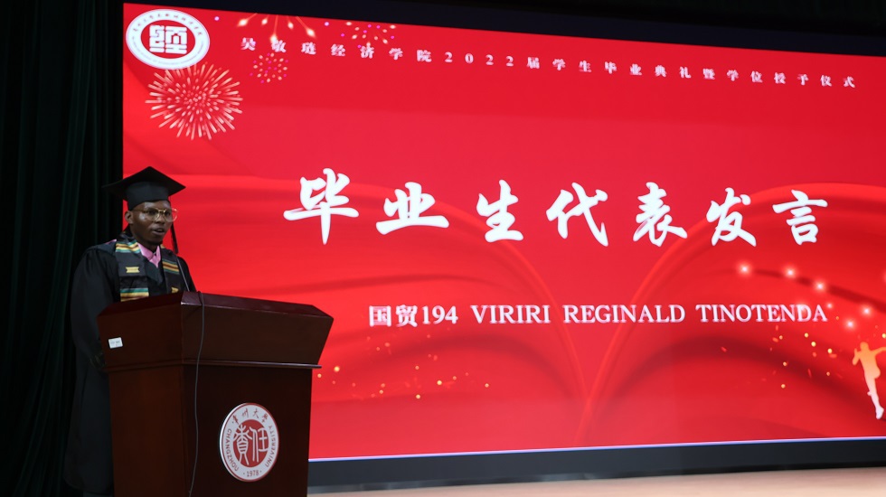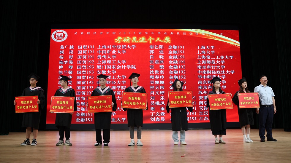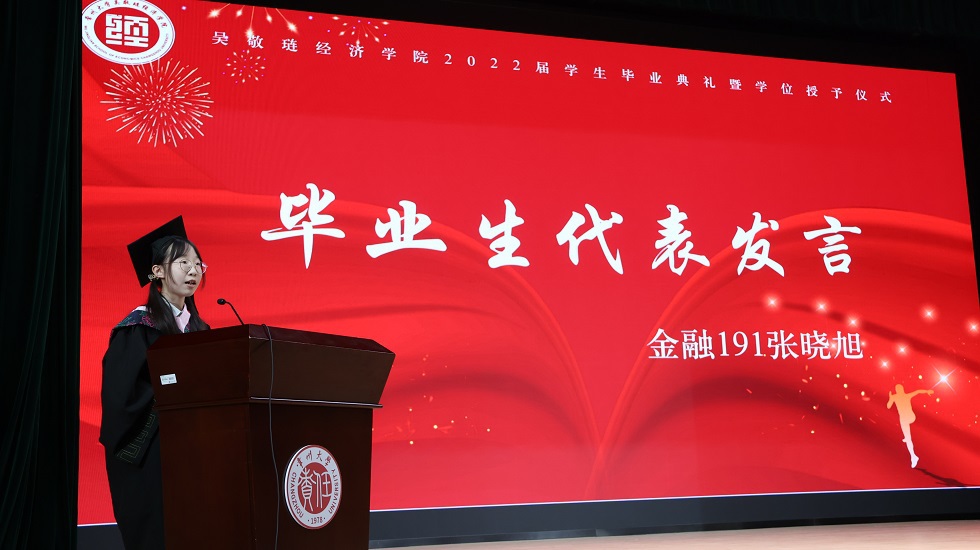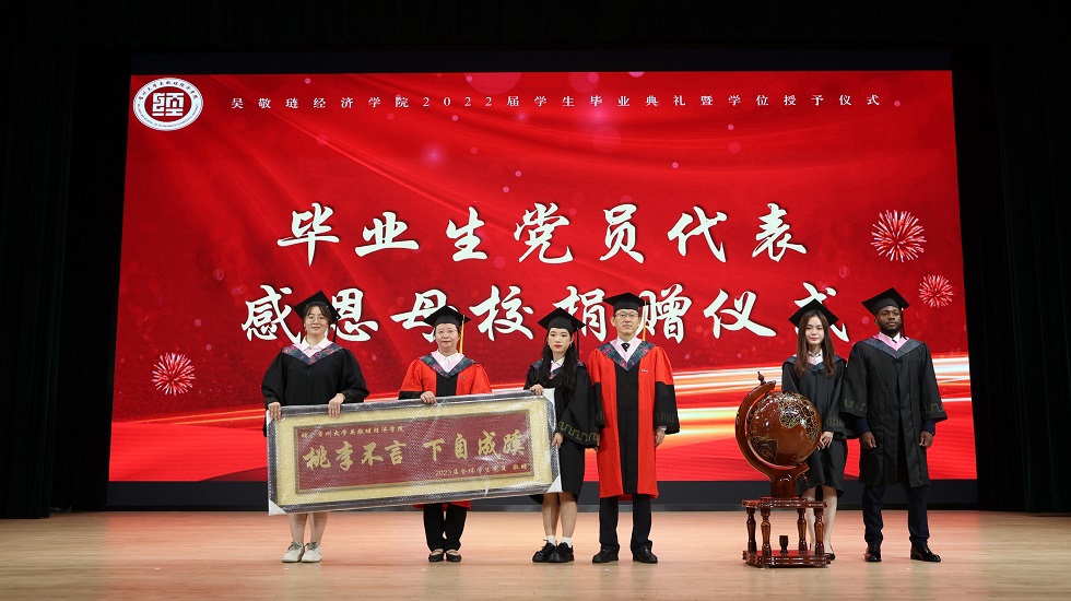 接下来,龚东卫为考研先进个人、考研优秀班集体颁发表彰。院长助理、金融系主任曹启龙宣读校优秀毕业生表彰决定。随着动感舞蹈的律动,朗朗诵读的萦绕,2023届毕业生学位授予仪式开始,由姜鸿、季小立等十位老师为2023届毕业生拨穗正冠。随后,金融191张晓旭和国贸194 VIRIRI REGINALD TINOTENDA作为优秀毕业生代表发言,他们感恩母校与老师的悉心培育,勉励全体毕业生坚定信念、追逐梦想,不负青春年华。紧接着,毕业生捐赠仪式及学院毕业礼品发放仪式开始,感恩母校情、莘莘学子心在这一刻彰显。邓伟为毕业生颁发校友联络员聘书,希望校友联络人架起母校与毕业生间坚固的桥梁。龙腾虎跃,舞姿铿锵,留学生舞龙队带来的表演振奋全场。最后,典礼在一首《凤凰花开的路口》中落下帷幕,圆满收官。
