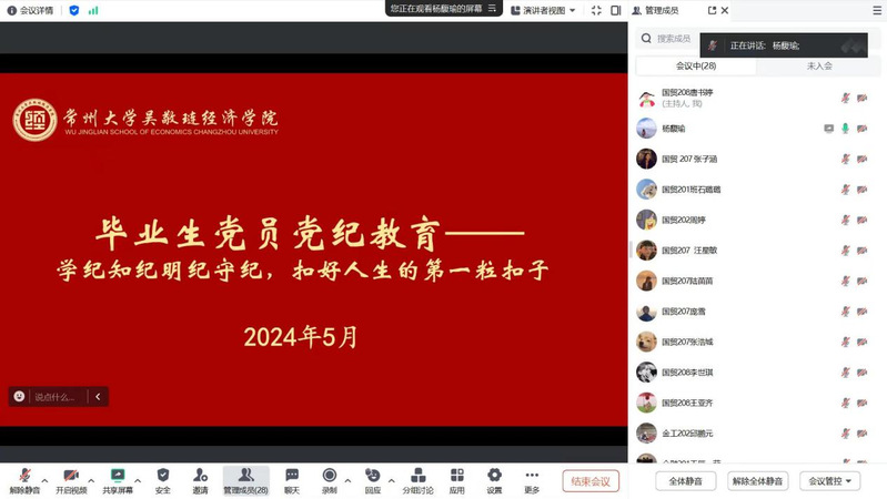 5月28日晚,学院学生党支部开展毕业生党员线上党纪教育学习,会议由党支部书记杨馥瑜老师主持,支部全体毕业生党员参会。