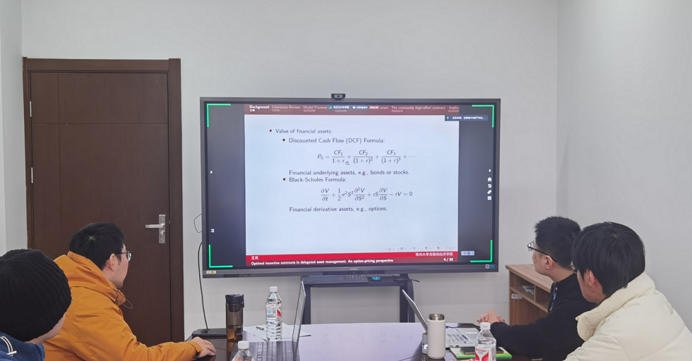 杨婷婷老师的报告主题为“Uncertain mean-chance model with background risk considering liquidity and reality constraints”。该研究通过不确定性理论,将风险资产收益、背景资产收益以及换手率作为不确定变量,利用不确定机会风险测度,提出了一个考虑流动性、交易成本约束条件下,具有背景风险的不确定均值-机会模型。王欢老师的报告主题为“Optimal incentive contracts in delegated asset management: An option-pricing perspective”。该研究以期权定价为视角,探讨了委托资产管理中的最优激励契约设计问题,基于在连续时间下包含风险中性委托人和风险规避代理人的模型,应用动态规划方法求解,并比较了四种激励方案的数值模拟结果。姜旭老师的报告主题为“定向信贷支持与民营企业融资问题研究”。该研究构建了一个具有银行、企业双重异质性以及双重金融摩擦机制的动态一般均衡模型,模拟了央行定向再贷款等政策工具对民营企业信贷融资的支持作用。