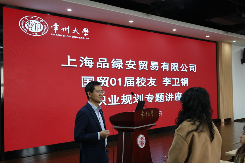 12月17日,上海品绿安贸易有限公司总经理、国贸01届毕业生李卫钢校友应邀来院作职业规划讲座。上海品绿安贸易有限公司副总张健、人力资源经理李盈出席活动。学院国贸专业2022级学生及部分毕业生代表参加活动。讲座由学院党委副书记许丹丹主持。