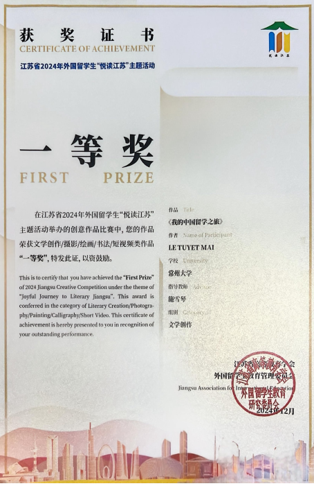 学院国际商务专业留学生LE TUYET MAI 的作品《我的中国留学之旅》脱颖而出,荣获江苏省文字创作类一等奖。该作品以细腻的笔触、真挚的情感,生动地展现了她在中国留学期间的所见、所闻、所感以及对中国文化的深刻理解和热爱。