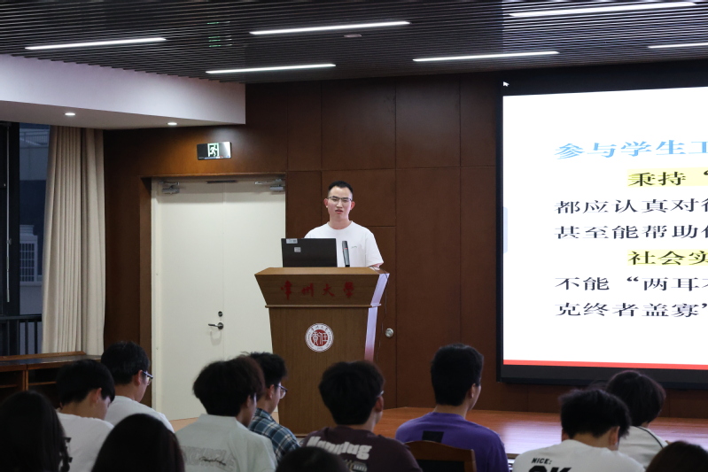 姚宇杰同学结合自身丰富的实践经历,分享了在学院团学部门工作与科研探索中的成长感悟。他以自身为例,阐述在工作实践中提升写作能力的具体方法,建议同学们在生活中始终保持学习的一种心态,不断积累知识,积极寻求解决问题的方法,切勿“两耳不闻窗外事”。在科研分享环节,他系统剖析文献研读、数据搜集与分析等内容,分享了实用的研究方法与思路。科研并非闭门造车,需要在试错中积累经验,在交流中碰撞智慧。
