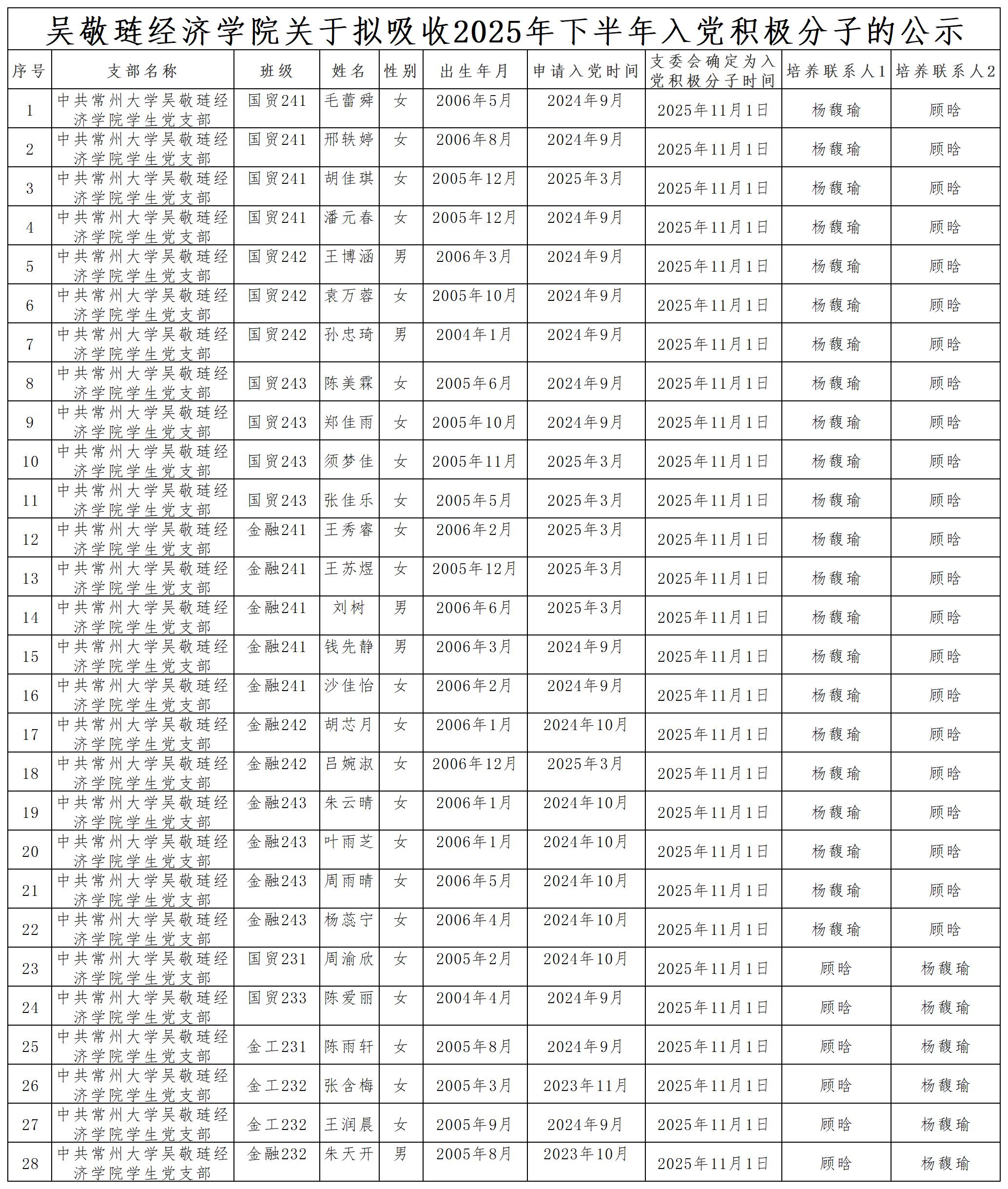 根据我校2025年下半年入党积极分子发展工作有关要求,经本人申请、群团组织推优,学生党支部委员会讨论研究,拟吸收以下28名同志成为入党积极分子,现将名单予以公示。