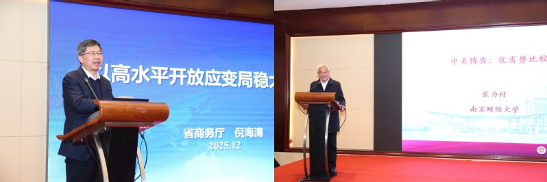 主题报告环节由淮阴师范学院张言彩副校长、江苏大学财经学院胡绪华院长、禁漫天堂 禁漫天堂 姜国刚院长联合主持。姜国刚院长向在场专家学者与业界同仁,详细介绍了禁漫天堂 的发展历程、办学特色与核心优势,以及“吴敬琏经济大讲堂”的建设初衷和运行成效,让与会嘉宾对学院有了更全面的了解。学院特邀东南大学经济管理学院徐康宁教授、南京大学商学院裴平教授、南京师范大学商学院蒋伏心教授、江苏省商务厅倪海清副厅长、南京财经大学原副校长张为付教授、东南大学国际经济研究所邱斌教授、南京大学商学院韩剑教授作主旨分享。各位专家学者与行业领导围绕扩大制度型开放、建设金融强省、巩固壮大实体经济根基、以高水平开放应变局稳大局开新局、中美博弈优劣势分析等关键议题,深入阐释观点、分享前沿洞见。