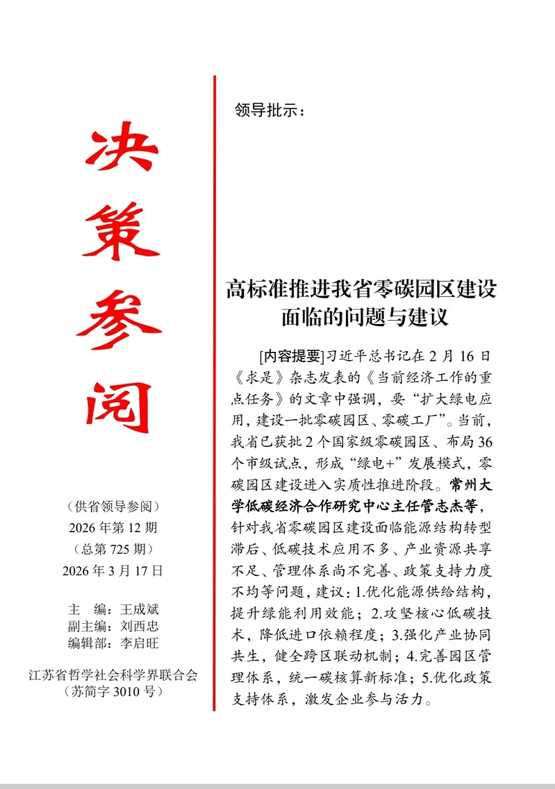 近日,我院管志杰教授与国贸242班王博涵撰写的决策咨询报告《高标准推进我省零碳园区建设面临的问题与建议》在江苏省哲学社会科学界联合会内刊《决策参阅》2026年第12期发表,并获江苏副省级领导肯定性批示。